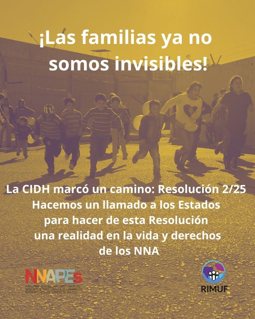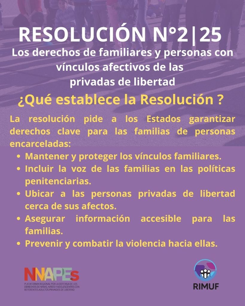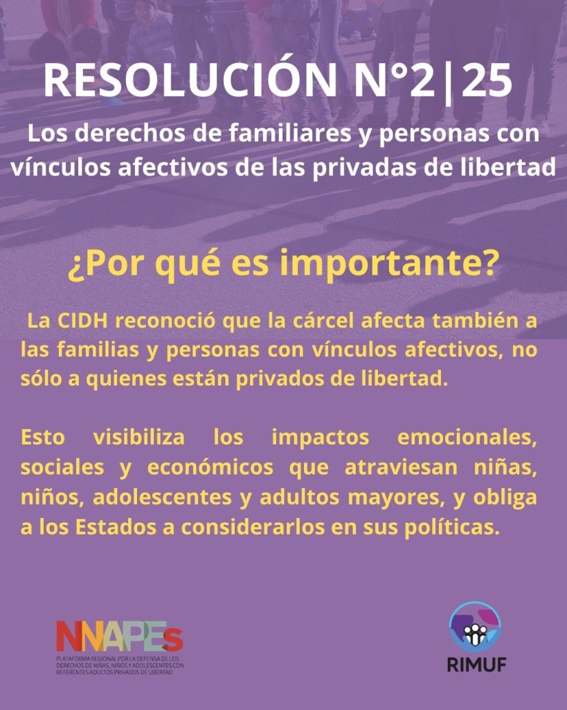 Este 2025 quedará marcado como un año histórico. Después de muchos años de trabajo incansable, articulado y en red por parte de las organizaciones que integran RIMUF, la Plataforma NNAPES y distintos aliados, se logró la Resolución 2/2025 de la CIDH, un reconocimiento fundamental que visibiliza a las familias de las personas privadas de la libertad y afirma sus derechos.