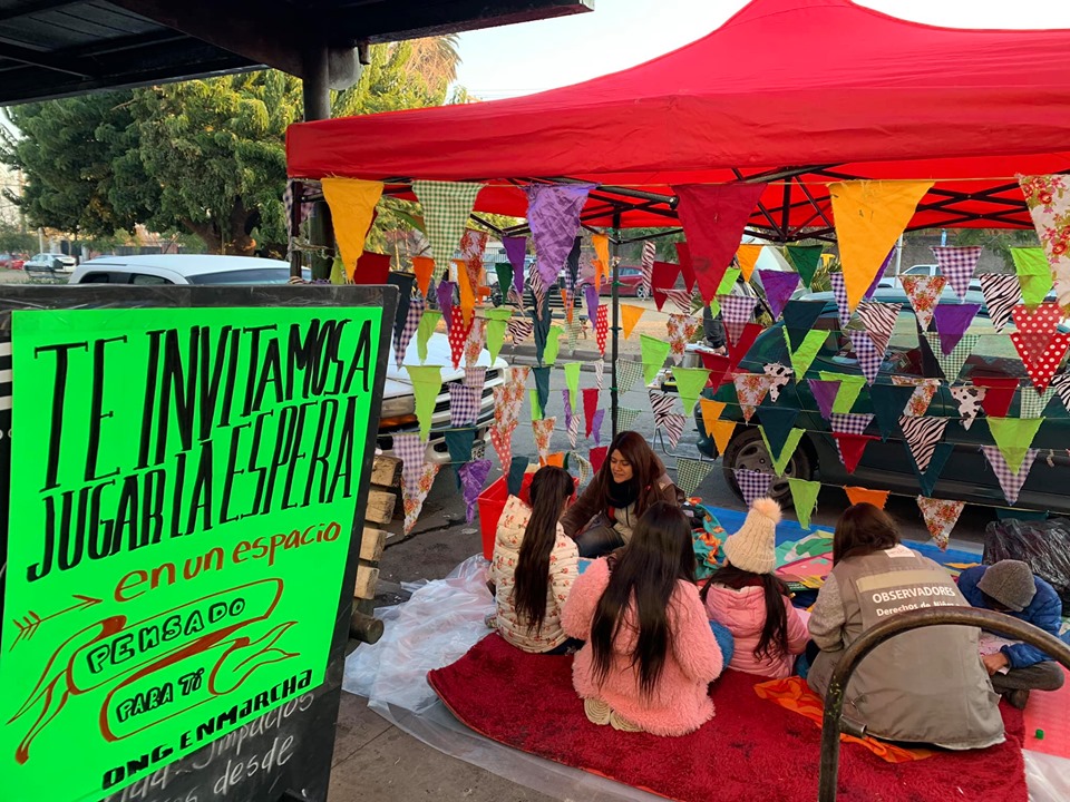 Desde, Chile, la organización Enmarcha viene trabajando en una línea similar. Durante estos meses se ha desarrollado una propuesta de ludoteca en las filas de centros penitenciarios (averiguar si es uno o mas de uno) para acompañar a los niños y niñas en la espera. Esta propuesta ha tenido lugar en los días de fechas especiales, que es cuando más niños, niñas y adolescentes visitan a sus familiares privados de libertad. Se trata de un espacio para relajarse, dibujar, pintar y entretenerse mientras esperan para entrar a las visitas.